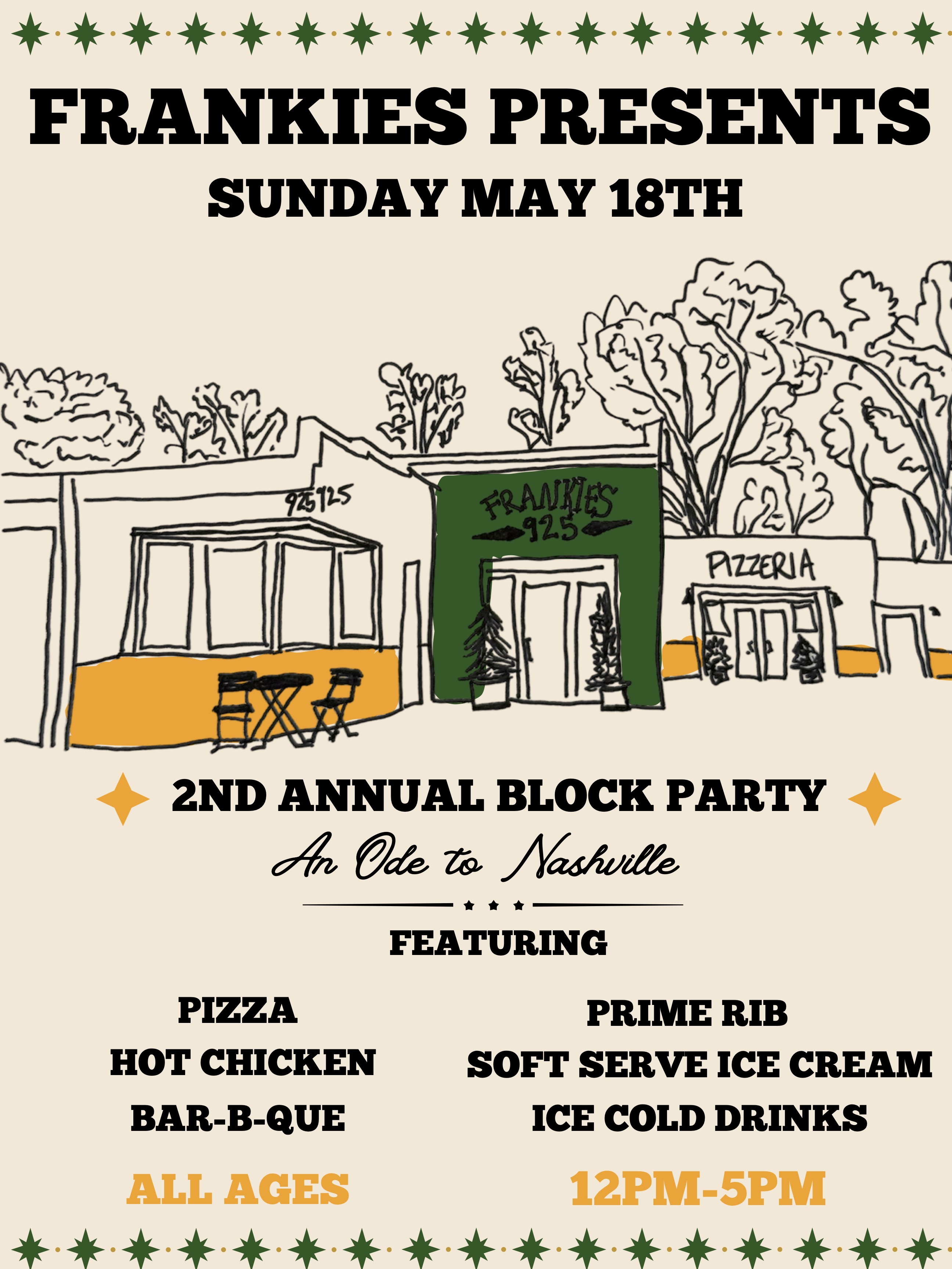 FAQ - This should answer all of your inquiries for our first Block Party. If you do have additional questions please email us hello@frankiesnashville.com and we'll be quick to reply!